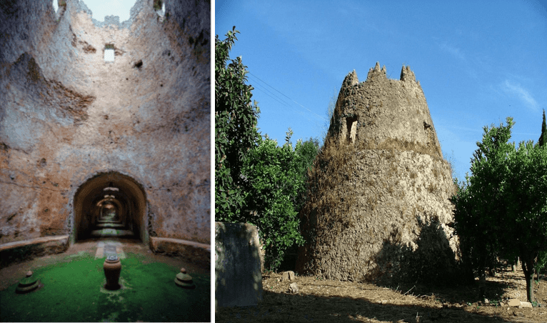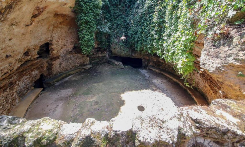 You enter the scirocco room down a 3-meter staircase and into the 5x5m 2 space, with two “galleries” or tunnels, the Major and the Minor. These are 3 meters high and wide with openings above to let heat escape, and run 50 meters under the property in northwest and southeast directions. The Major Gallery ends in an 8×8.5m open-air gathering space pictured below: Room of Four Canne. The Round Fountain intersects the Major Gallery, and, above ground, there is a well from the Medieval-era in the same spot. You can see both in the pictures below: